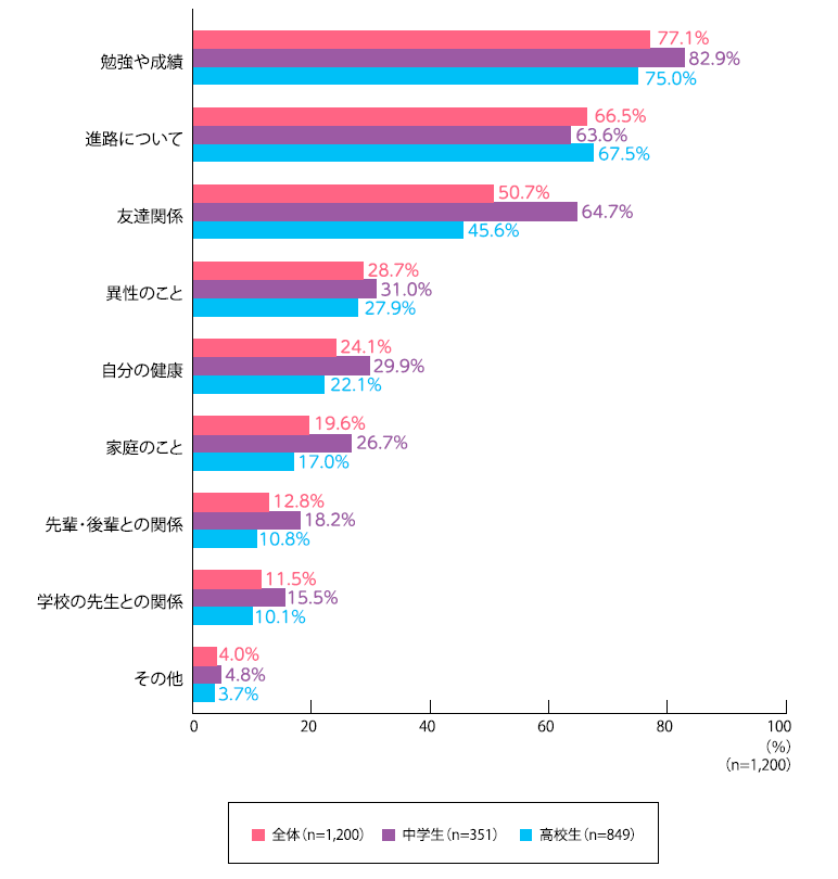 中高生が今、悩んでいることは、「勉強や成績」(全体77.1%、中学生82.9%、高校生75.0%)が最も多く、次に「進路について」(全体66.5%、中学生63.6%、高校生67.5%)があげられ、勉強・進学への悩みが圧倒的に多いようです。