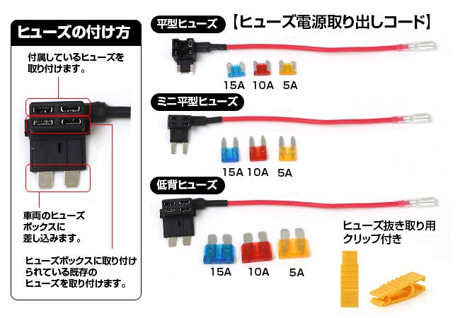 ヒューズボックスのヒューズと差しかえるだけで電源が簡単に取り出せます。