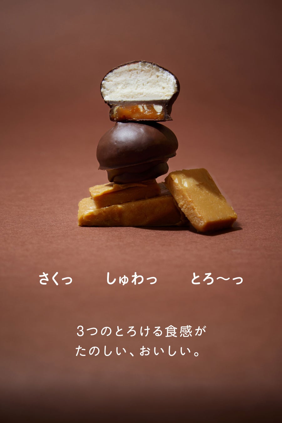 「さくっ、しゅわっ、とろ〜っ」の新食感プレミアムスイーツ。3つのとろける食感がたのしい、おいしい。