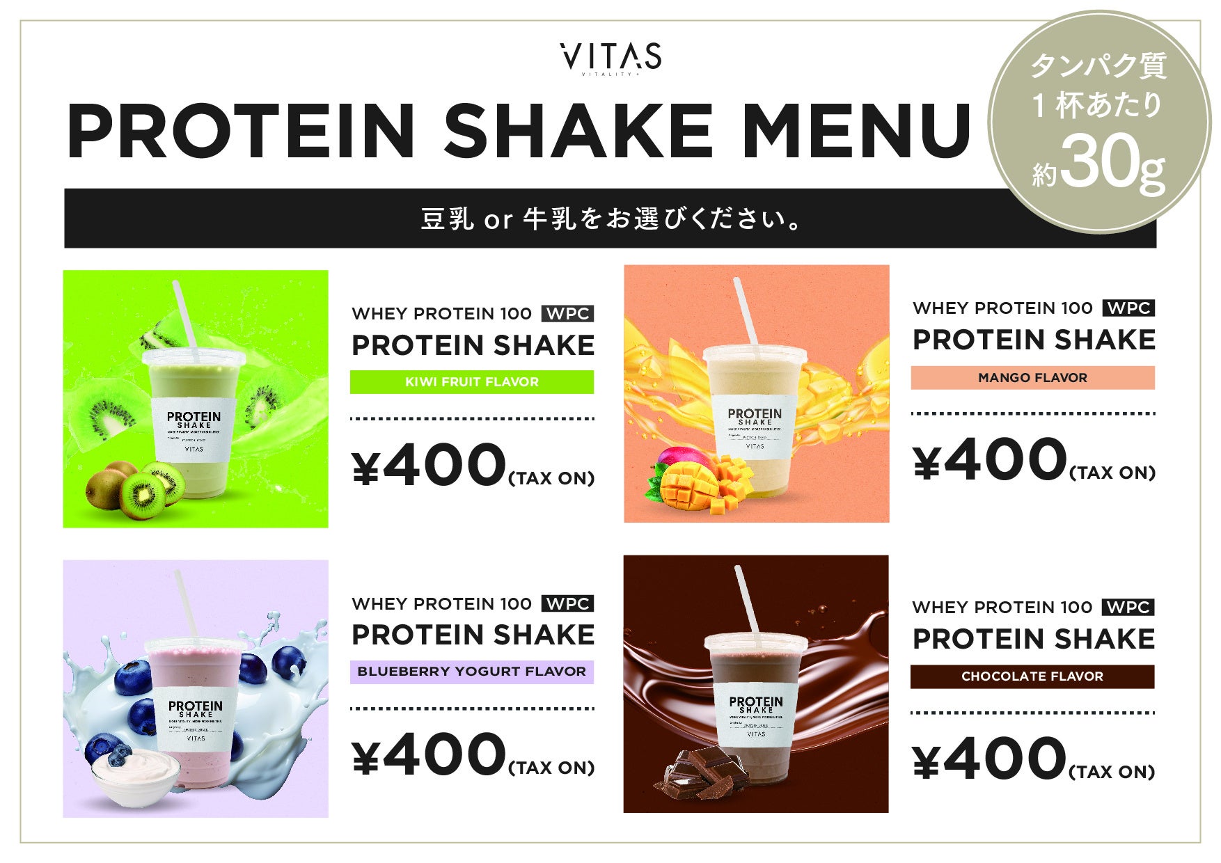 今回、ストアには VITAS の DELICIOUS PROTEIN を使用したシェイク4種が登場!