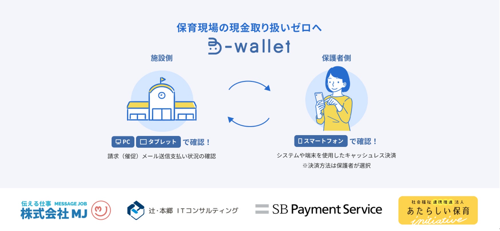 株式会社MJ(本社:大阪市、代表取締役社長:藤田 将、以下「MJ」)、辻・本郷 ITコンサルティング株式会社(本社:東京都渋谷区、代表取締役:黒仁田 健、以下「辻・本郷ITC」)、SBペイメントサービス株式会社(本社:東京都港区、代表取締役社長 兼 CEO:榛葉 淳、以下「SBPS」)および社会福祉連携推進法人あたらしい保育イニシアチブ(本部:和歌山県紀の川市、代表理事:前田 効多郎、以下「あたらしい保育イニシアチブ」)の4社は、保育業界のキャッシュレス化を推進するためのソリューション「B-wallet」の導入拡大に向けて2025年1月31日に連携いたしました。