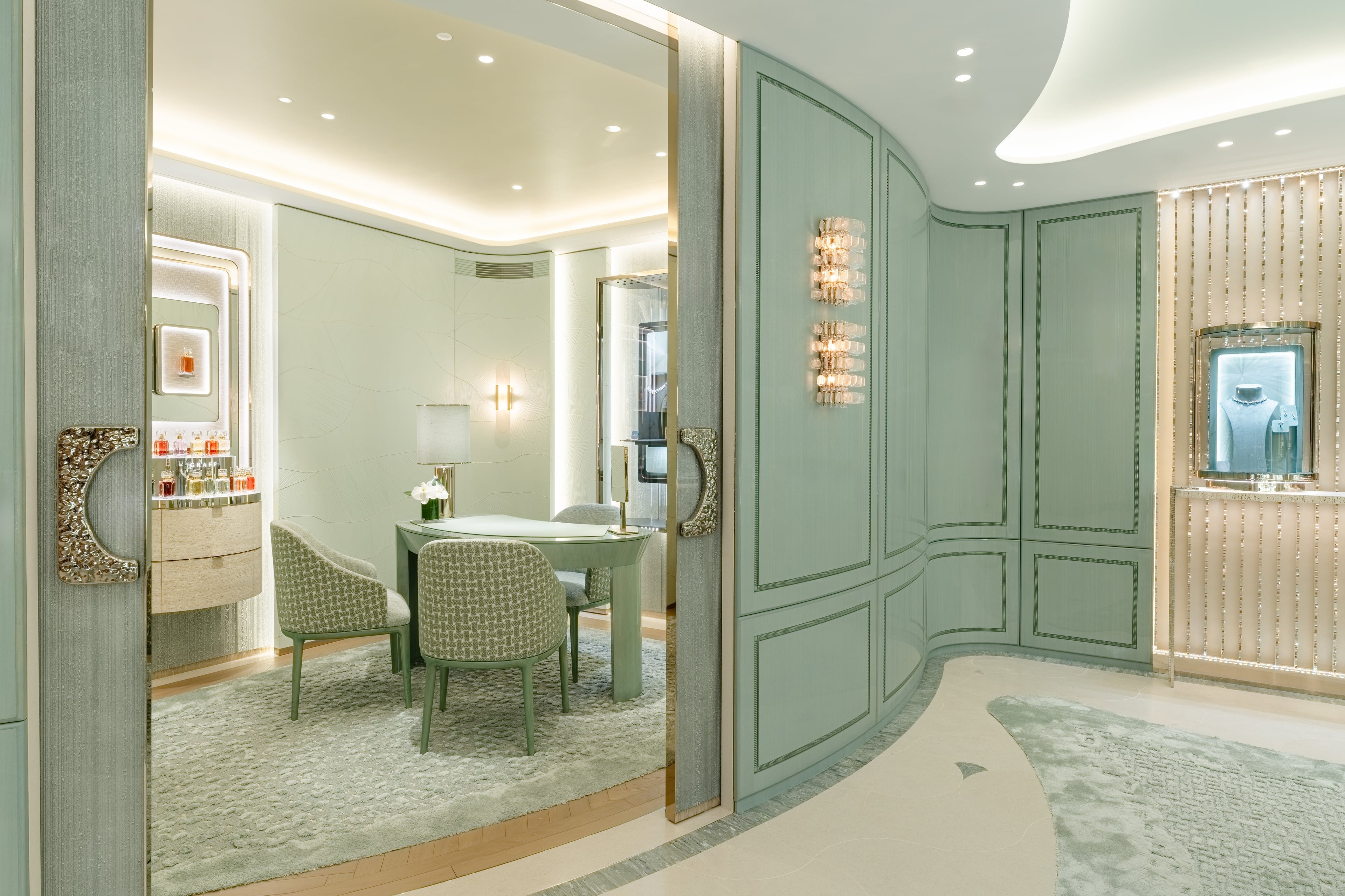 さらに、スライドドアで仕切られたVIPルームでは、グラフの匠の職人が手掛ける最新のハイジュエリークリエイションを、落ち着いたプライベートな空間でゆっくりとお楽しみいただけます。またVIPルームの壁面には、グラフが手掛けた世界最大のスクエアエメラルドカット ダイヤモンド「ザ グラフ レセディ ラ ロナ(302カラット)」にインスピレーションを得たフレグランスコレクション「グラフ レセディ ラ ロナ」がディスプレイされています。