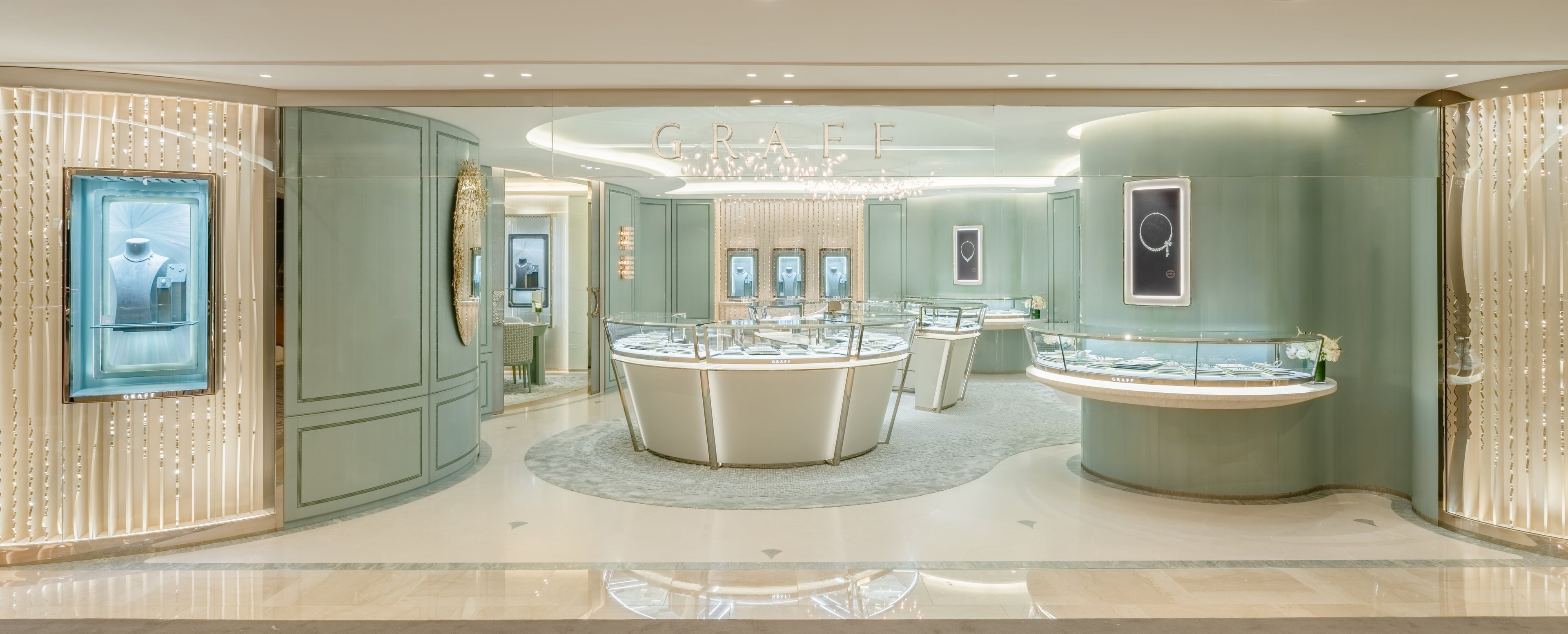 パールホワイトとゴールドの色調で表現された流麗なウェーブを描くファサードには、グラフを象徴するモチーフ「アイコン」のシルエットの連なりが透明感のあるアクセントを添え、美しい世界観を描き出します。店内に足を踏み入れると、優美な曲線を描くショーケースに、グラフを代表するソリテールリングやブライダルジュエリー、さらには「バタフライ」や「ティルダズ ボウ」、「ローレンス グラフ シグネチャー」をはじめとする人気のジュエリーコレクションが揃い、充実したラインナップをご覧いただけます。店内は、折り紙にインスピレーションを得たシャンデリアの淡く柔らかな光に包まれ、ウッドパネルやカットガラスの装飾と、ダイヤモンドのファセットにインスピレーションを得たショーケースが美しく調和しています。また、床にはフランスの職人によってグラフのために特別に仕立てられたブークレのカーペットと、アイコンモチーフがさりげなくあしらわれたライムストーンが用いられています。