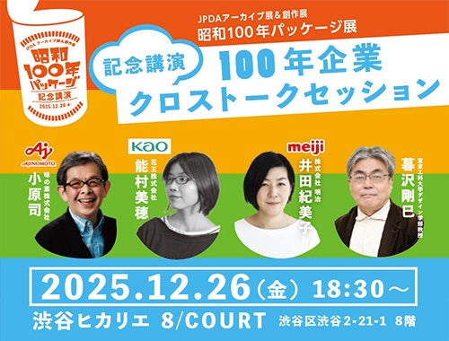 2025年12月23日〜30日に開催される「昭和100年パッケージ」展開催を記念し、創業から100年以上続く企業のインハウスデザイナーの皆様をお迎えして、昭和の時代を生き抜いた商品にまつわるエピソードや時代の流れに対する変化、これからの100年に向けたお考えなどを、パッケージデザインと絡めてお話しいただきます。展覧会観覧とあわせて、奮ってご参加ください。