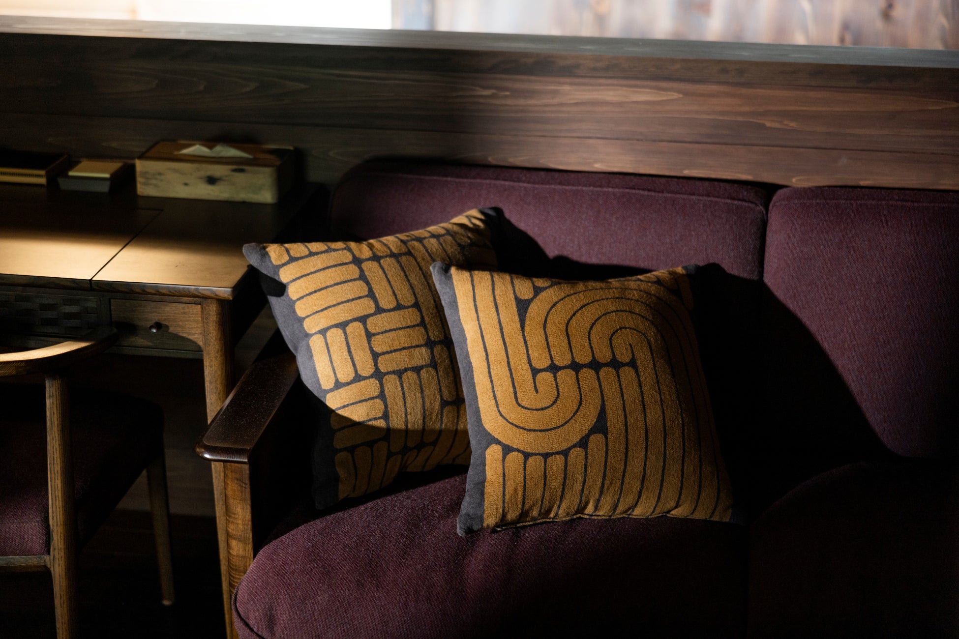 静岡の基幹産業であるお茶。その製造工程で捨てられてしまう部分の茶葉を染料として使用。染め上がる作品は、渋みのあるチャコールグレーに仕上がります。使用した茶殻は、堆肥へと加工し、畑へ循環していく、静岡ならではのサステナブルな体験です。本体験では、染め上がった布地を「抜染」という技法で色を抜くことで、鮮やかな黄金の柄を描きます。