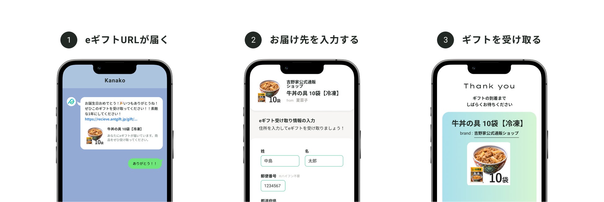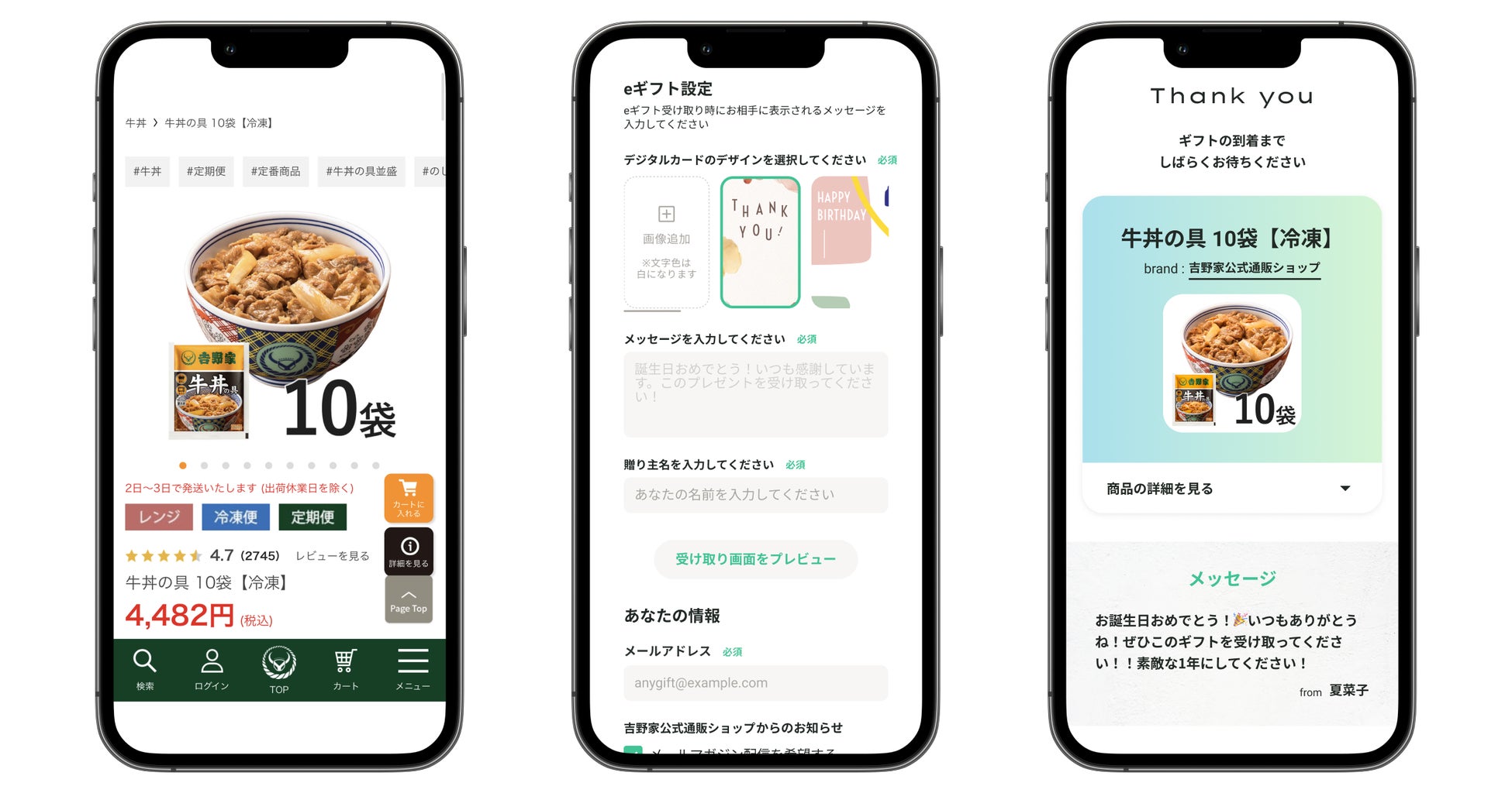 今回、当社のAnyGiftの提供により、「吉野家公式通販ショップ」にて冷凍牛丼の具やセット商品などの大人気商品がeギフトとして贈れるようになります。