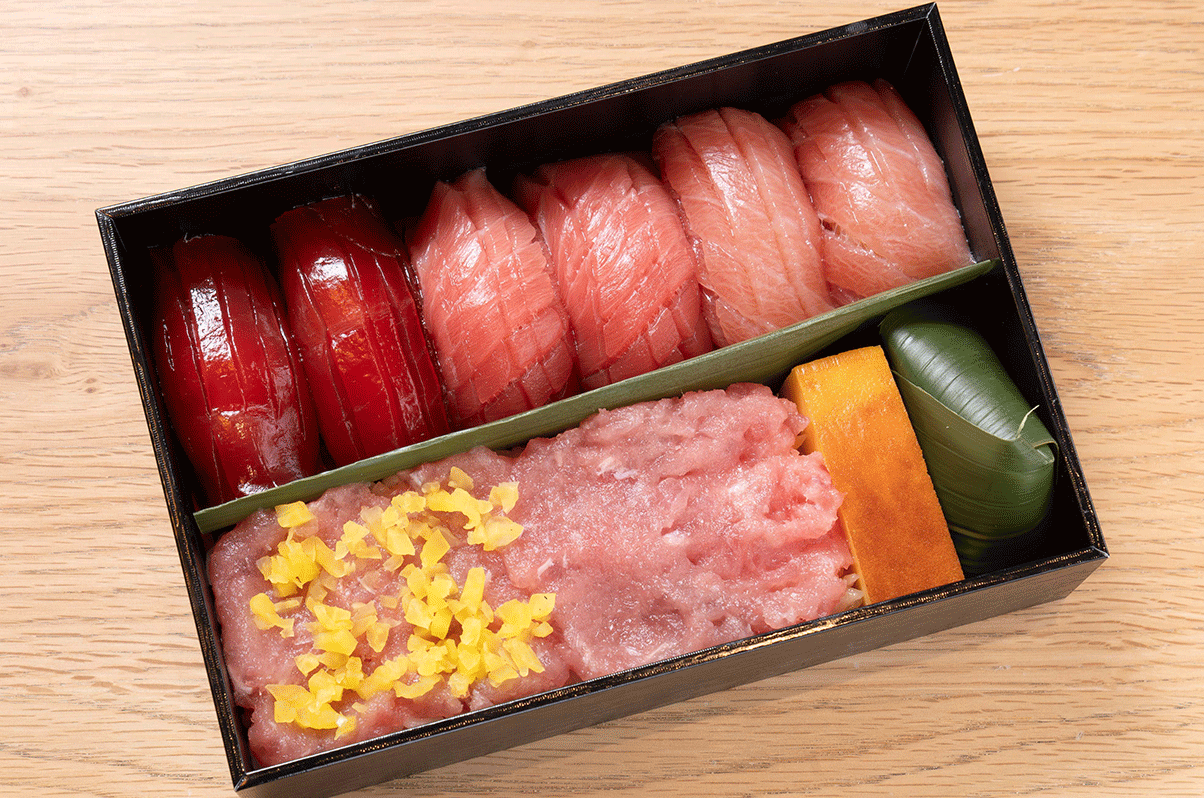 今回、当店初の試みとして銀座の老舗デパート『松屋銀座』にて、物販店舗を期間限定でオープンすることとなりました。物販店舗では、実店舗と同じ高クオリティの食材を使い、実演販売でご提供。商品は総料理長が今回だけのために、銀座という立地に相応しい、見た目も華やかな《持ち帰り専用寿司》を4点開発いたしました。ご家族や大切の方へのお土産、そして自分へのご褒美に最適な寿司弁当です。