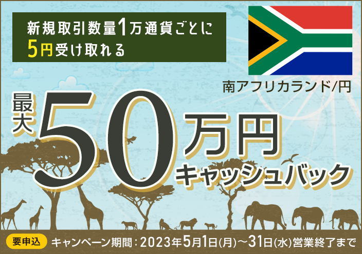 キャンペーンに申し込まれたお客さまに、期間中における南アフリカランド/円の新規取引合計数量に応じて、最大500,000円をキャッシュバックします。