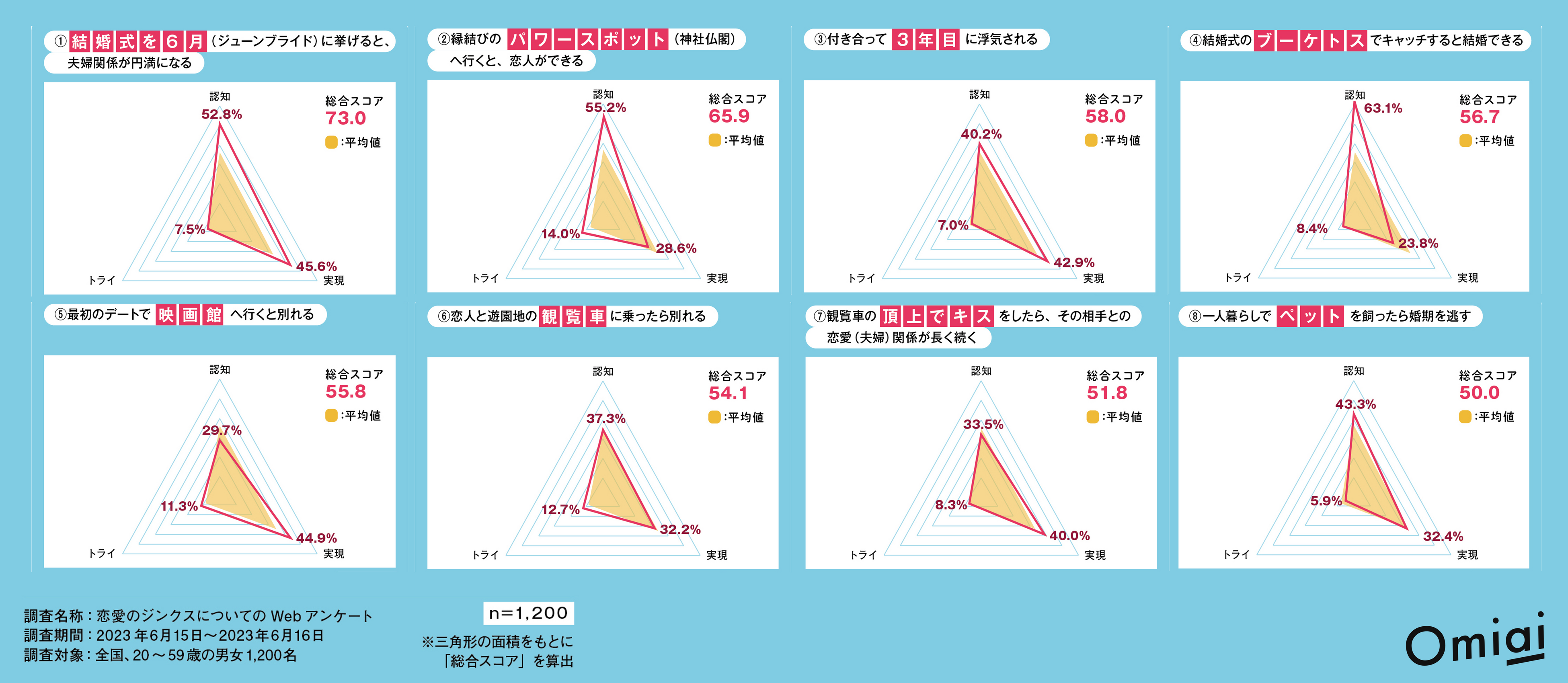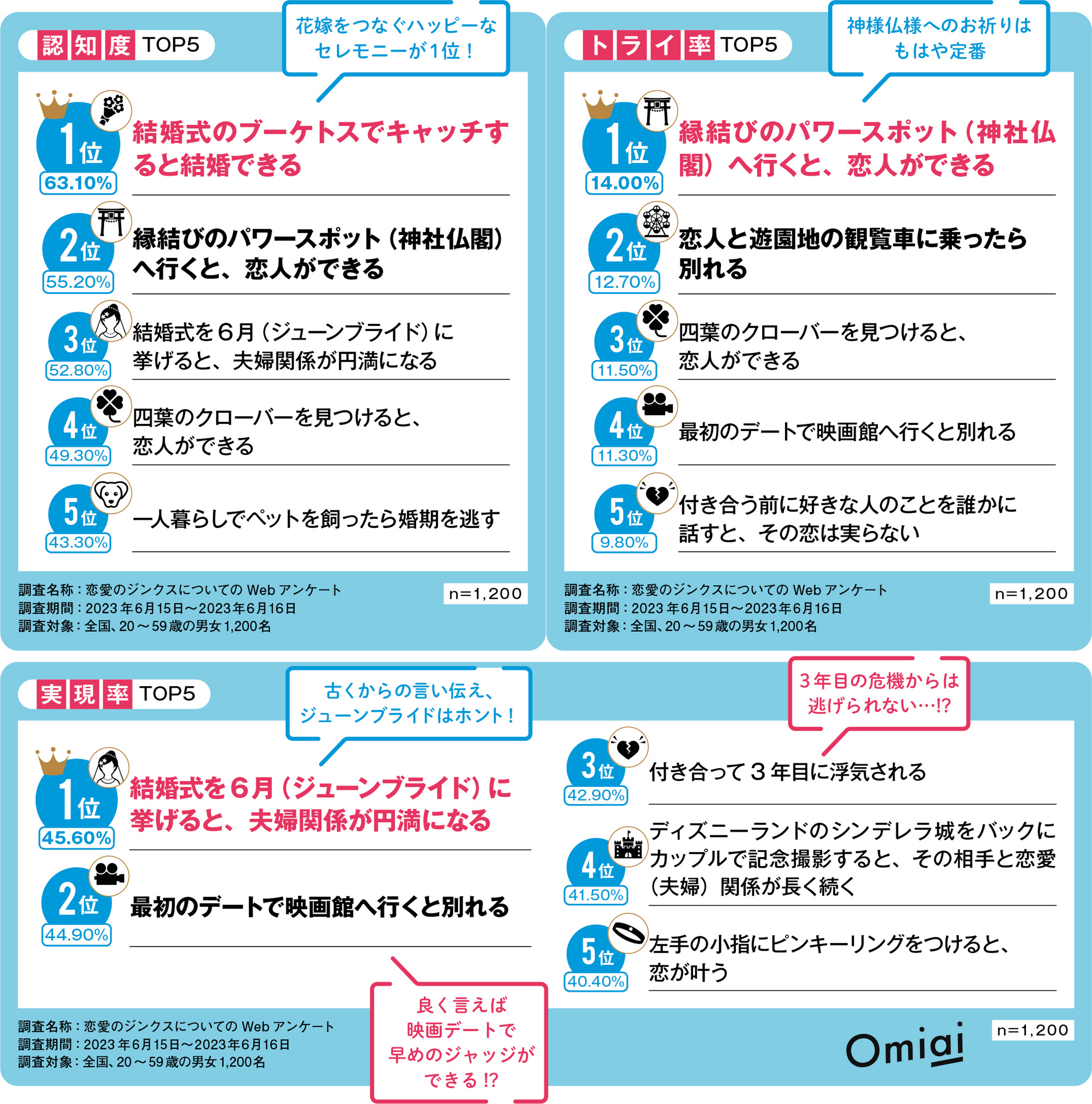 全国の20〜59歳の男女1,200名を対象に、「Omiai Report」編集部がピックアップした定番的な恋愛ジンクスについてアンケート調査を実施。「ジンクスの通りになった」「実践したがこのジンクスの通りにならなかった」「このジンクスを実践/経験したことがない」「このジンクスは聞いたことがない」のいずれかで回答してもらい、各ジンクスの認知度、トライ率、実現率を割り出しました。