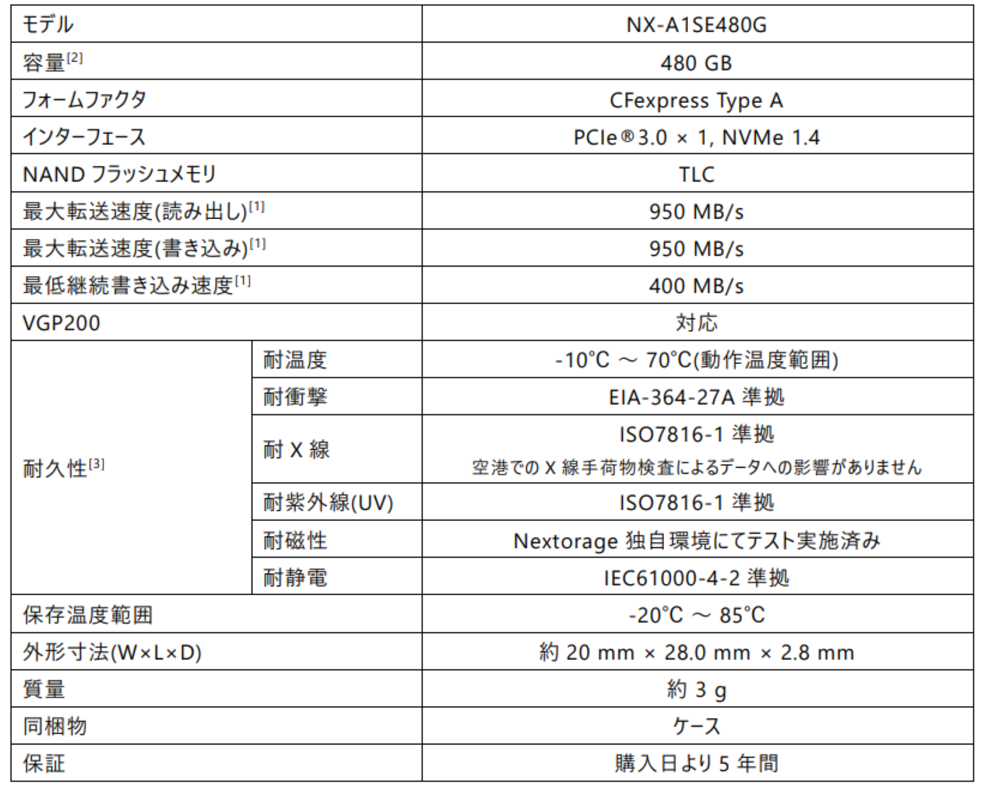 ・CFexpress Type A メモリーカード NX-A1SEシリーズ NX-A1SE480G 製品情報 Nextorage WEBサイト