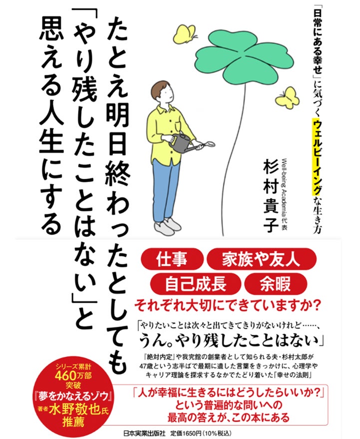 そして、この本は、15年連続で学生生協1位となるなど就活のバイブルとして知られる『絶対内定』の著者であり、日本初のキャリアスクール「我究館」の創業者でもある著者の夫・杉村太郎が47歳という志半ばで原発不明がんで亡くなる直前に遺した「やりたいことは次々に出てくるけれど、うん。やり残したことはない」という言葉をきっかけに生まれました。