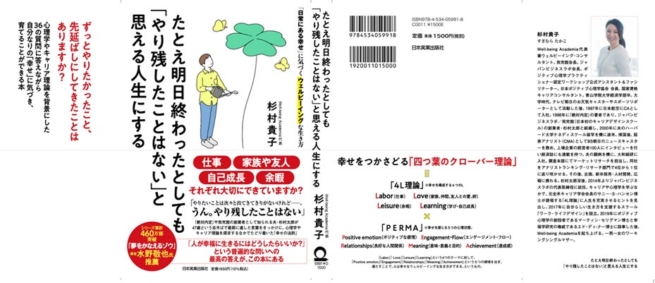 キャリアデザインスクール「我究館」、語学コーチングスクール「プレゼンス」、ライフキャリアデザインスクール「Well-being Academia」を運営するパスメイクグループの株式会社ジャパンビジネスラボ(本社:東京都港区)の会長杉村 貴子は、心理学やキャリア理論を背景にした36の質問に答えながら自分なりの幸せに気づくことができる本『たとえ明日終わったとしても「やり残したことはない」と思える人生にする~「日常にある幸せ」に気づくウェルビーイングな生き方~』を日本実業出版社より出版します。本書は2023年3月9日(木)より全国書店にて販売いたします。