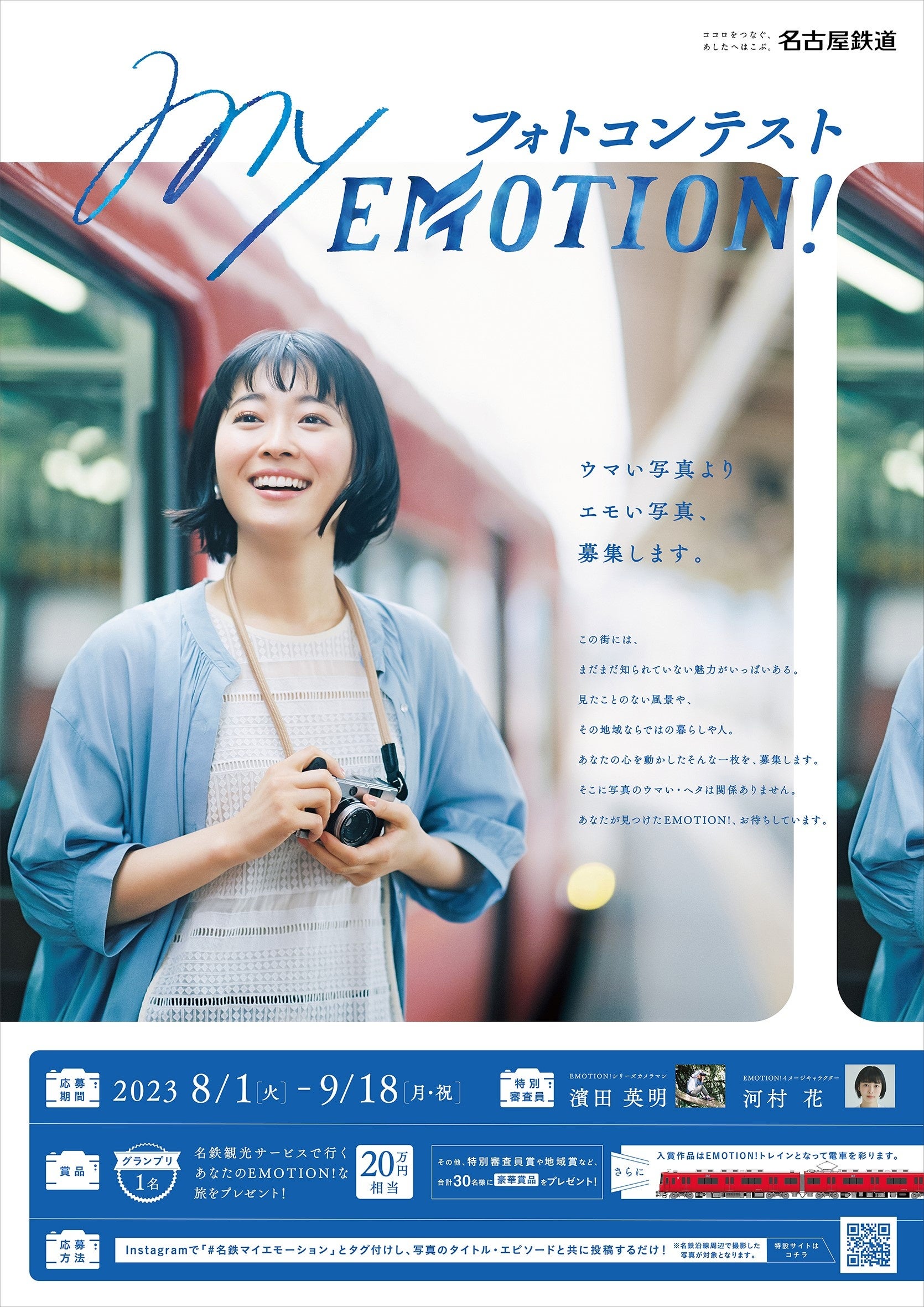 また、特別審査員として、EMOTION!シリーズをすべて撮影しているカメラマンの濱田英明さんと、EMOTION!のイメージキャラクターである河村花さんをお迎えし、受賞作品を決定します。受賞作品を撮影された合計30名の方には、名鉄沿線地域で「EMOTION!」な体験ができる豪華賞品をプレゼントします。