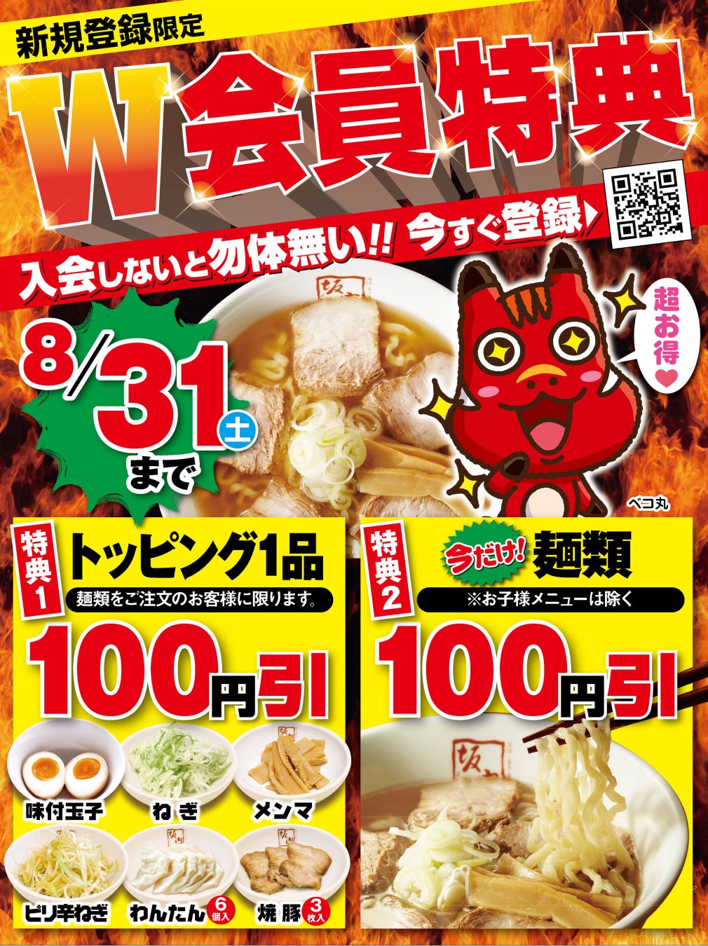 喜多方ラーメン坂内では公式アプリ『坂内モバイル倶楽部』にて、坂内各店と公式通販でご利用いただけるお得な情報や限定クーポンを配信しております。通常は新規会員 登録特典として「トッピング1品100円引き」クーポンをプレゼントしておりますが、8月中にアプリへご登録していただいた新規会員様へは、さらにお好きなラーメン1杯がお得になる「麺類100円引き」クーポンをプレゼントいたしま す。もちもちの平打ち多加水麺が特徴の喜多方ラーメンですが、当社はすっきりとした透明な豚骨スープをベースに、しょう油、塩、味噌の三味からなるラインナップをお選びいただけ、特製ドレッシングで和えたピリ辛ねぎや、焼豚 (チャーシュー)を炊いた煮汁で炊きこむ味付玉子、青唐辛子などのトッピングによってさらに幅広いアレンジをお楽しみいただけます。トッピングとラーメンのクーポンはもちろん併用可能です。Wで使えてお得な会員登録キャンペーンは今夏限定!この機会にぜひ『坂内モバイル倶楽 部』へ登録して、坂内の喜多方ラーメンをご堪能ください。