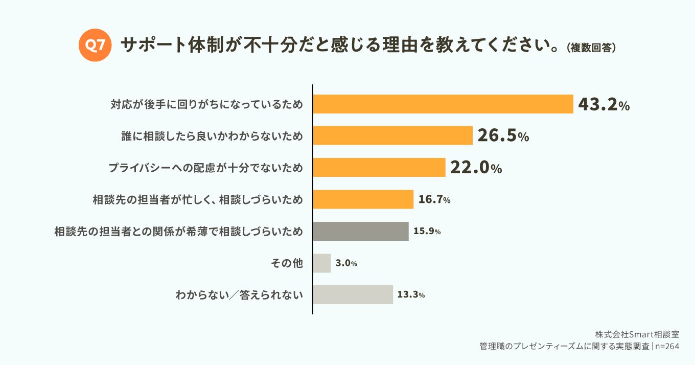 Q6で「あまりそう感じない」「全くそう感じない」と回答した方に、「Q7.サポート体制が不十分だと感じる理由を教えてください。(複数回答)」(n=264)と質問したところ、「対応が後手に回りがちになっているため」が43.2%、「誰に相談したら良いかわからないため」が26.5%、「プライバシーへの配慮が十分でないため」が22.0%という回答となりました。