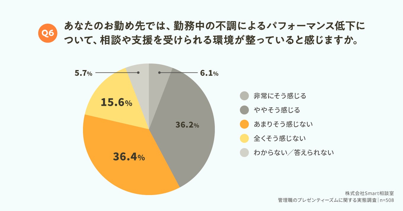「Q6.あなたのお勤め先では、勤務中の不調によるパフォーマンス低下について、相談や支援を受けられる環境が整っていると感じますか。」(n=508)と質問したところ、「あまりそう感じない」が36.4%、「全くそう感じない」が15.6%という回答となりました。