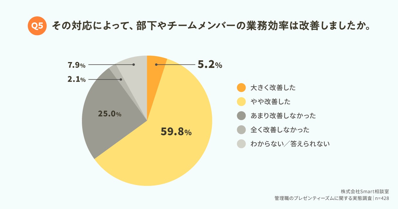 Q4で「対応はしていない」「わからない/答えられない」以外を回答した方に、「Q5.その対応によって、部下やチームメンバーの業務効率は改善しましたか。」(n=428)と質問したところ、「大きく改善した」が5.2%、「やや改善した」が59.8%という回答となりました。