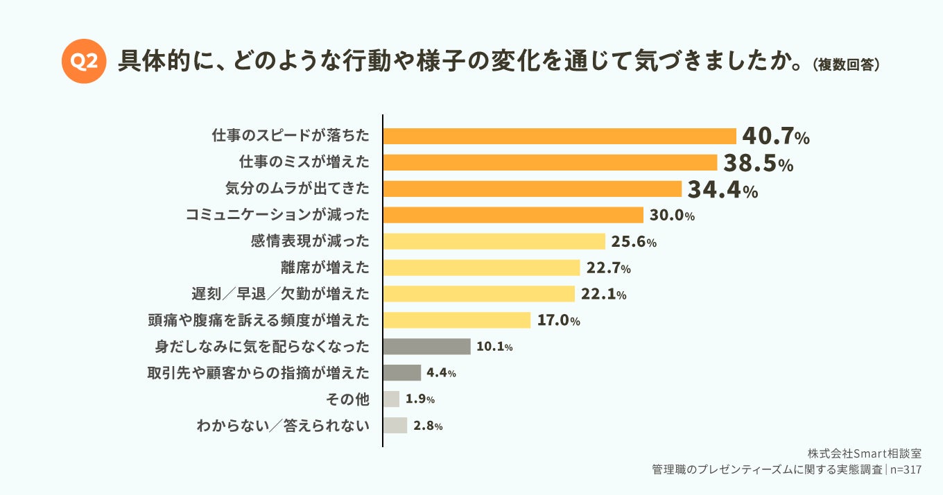 Q1で「頻繁にある」「時々ある」と回答した方に、「Q2.具体的に、どのような行動や様子の変化を通じて気づきましたか。(複数回答)」(n=317)と質問したところ、「仕事のスピードが落ちた」が40.7%、「仕事のミスが増えた」が38.5%、「気分のムラが出てきた」が34.4%という回答となりました。