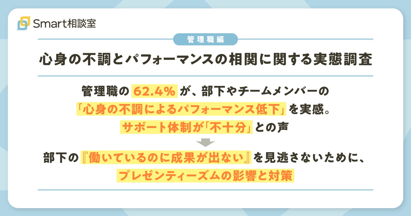 株式会社Smart相談室(本社:東京都港区、代表取締役・CEO:藤田 康男)は、管理職508名を対象に、「管理職編|心身の不調とパフォーマンスの相関に関する実態調査」を実施しましたので、お知らせいたします。