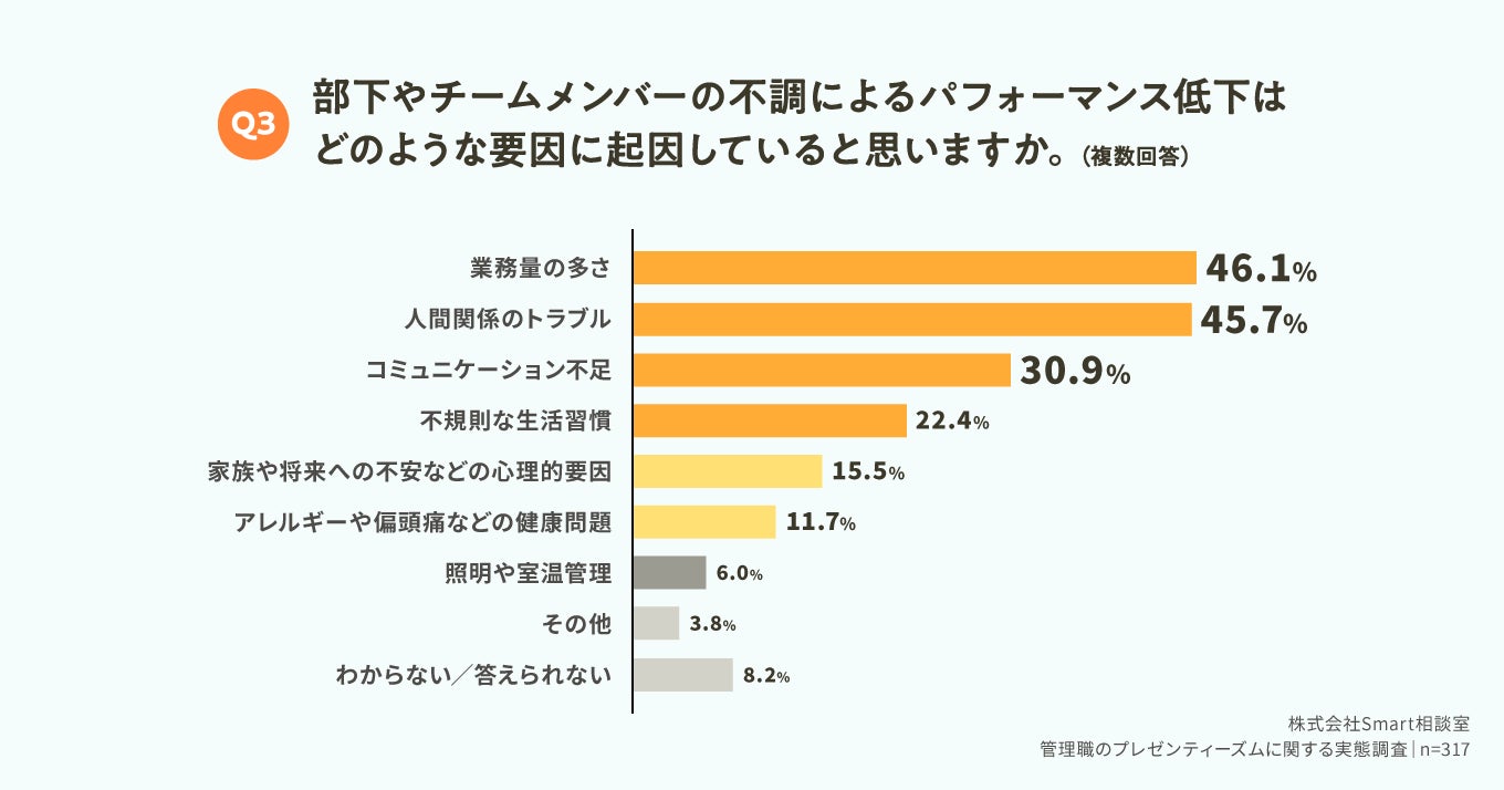 Q1で「頻繁にある」「時々ある」と回答した方に、「Q3.部下やチームメンバーの不調によるパフォーマンス低下はどのような要因に起因していると思いますか。(複数回答)」(n=317)と質問したところ、「業務量の多さ」が46.1%、「人間関係のトラブル」が45.7%、「コミュニケーション不足」が30.9%という回答となりました。