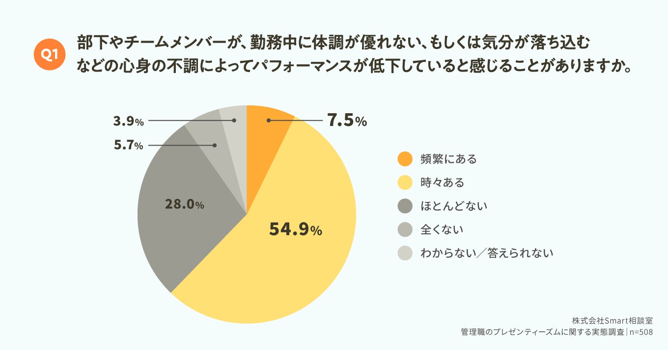 「Q1.部下やチームメンバーが、勤務中に体調が優れない、もしくは気分が落ち込むなどの心身の不調によってパフォーマンスが低下していると感じることがありますか。」(n=508)と質問したところ、「頻繁にある」が7.5%、「時々ある」が54.9%という回答となりました。