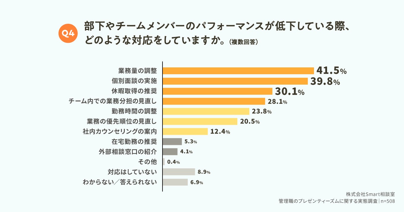 「Q4.部下やチームメンバーのパフォーマンスが低下している際、どのような対応をしていますか。(複数回答)」(n=508)と質問したところ、「業務量の調整」が41.5%、「個別面談の実施」が39.8%といった具体的な対応を行っている管理職が多数を占めました。また、「休暇取得の推奨」(30.1%)や「チーム内での業務分担の見直し」(28.1%)といった施策も一定数見られ、個々の状況に応じた多様なアプローチが行われています。
