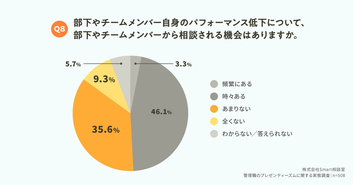 「Q8.部下やチームメンバー自身のパフォーマンス低下について、部下やチームメンバーから相談される機会はありますか。」(n=508)と質問したところ、「あまりない」が35.6%、「全くない」が9.3%という回答となりました。つまり、半数近くの管理職が部下やチームメンバーからの相談を受ける機会がほとんどない状況にあることがわかります。