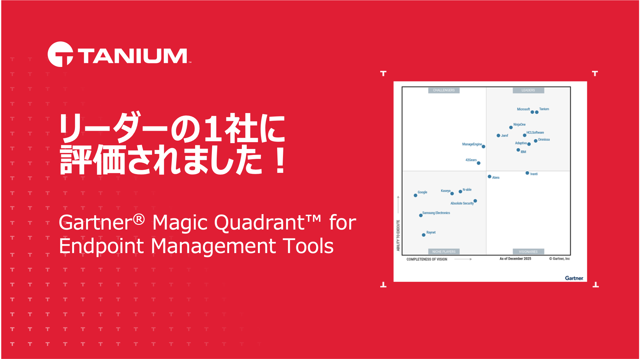 AIを活用した自律型IT ≪Autonomous IT≫ のリーダーであるタニウム(日本法人本社:東京都千代田区、代表執行役社長:原田英典、以下タニウム)は、ガートナー社が発表した2026年版「Gartner® Magic Quadrant™ for Endpoint Management Tools(エンドポイント管理ツールのマジック・クアドラント)」(出典1)において、リーダーの1社に位置づけられました。本レポートにつきまして、ガートナー社より日本語版が公開されたことをお知らせします。(URL: https://www.tanium.jp/resources/gartner-magic-quadrant-endpoint-management-tools-2026/)