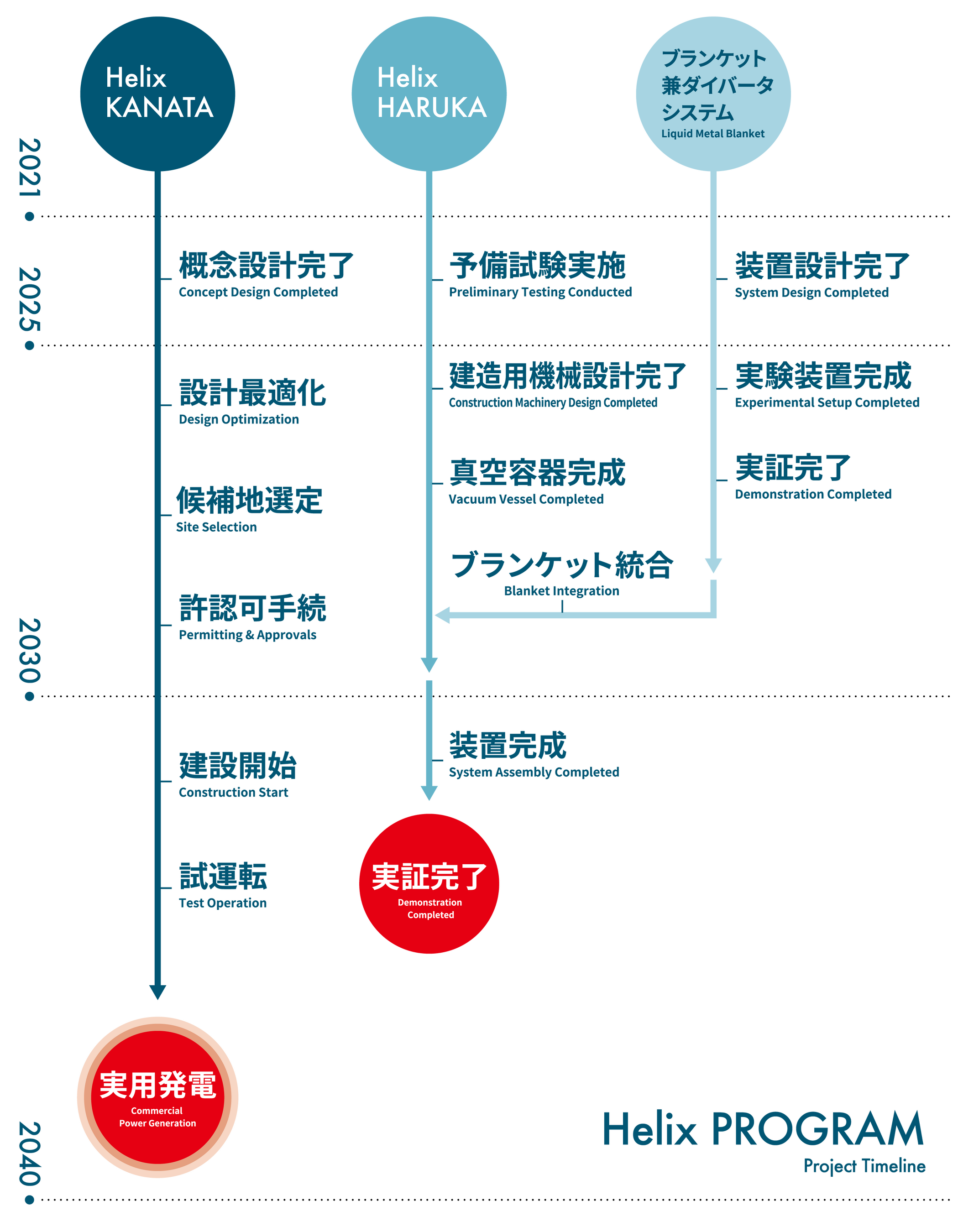 ヘリックス計画では、2020年代中をめどに二大開発要素「高温超伝導マグネット」「ブランケット兼ダイバータ」の個別実証を完了し、2030年代中には、最終実証装置「Helix HARUKA」による統合実証、および発電初号機「Helix KANATA」による世界初の実用発電を達成する計画です。