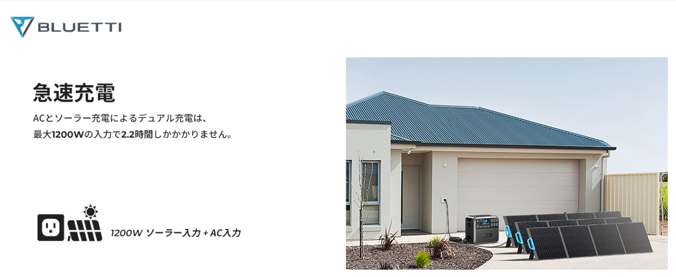 BLUETTI の主力モデルの 1 つである AC200P は、どこでも簡単に充電ができる、パワフルで価格の手頃な製品です。緊急時のバックアップ電源として、あるいは自給自足のオフグリッド生活に、どこでも充電が可能な太陽光発電キットをご活用いただけます。日照条件が良好な状態で PV200 ソーラーパネルを 3 枚使用すれば 600W の発電ができ、AC200P を3.5時間でフル充電できます。360 W の太陽光発電を実現する PV120 キットもご用意しています。今すぐキャンペーンをご利用ください!