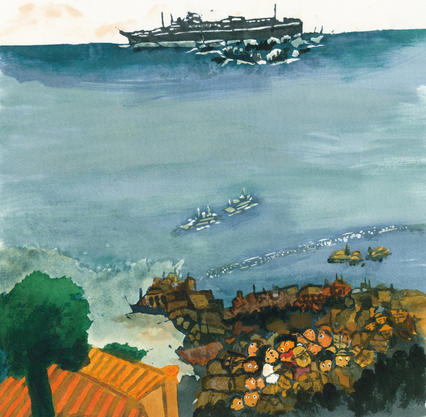 沖縄にせめてくるアメリカ軍から逃れるため、老人や子どもは日本本土へ疎開することになりました。ひろ子は、大きな輸送船、対馬丸にたくさんの人たちと乗り込みますが、アメリカ軍から魚雷攻撃をうけ、沈んでしまいます。