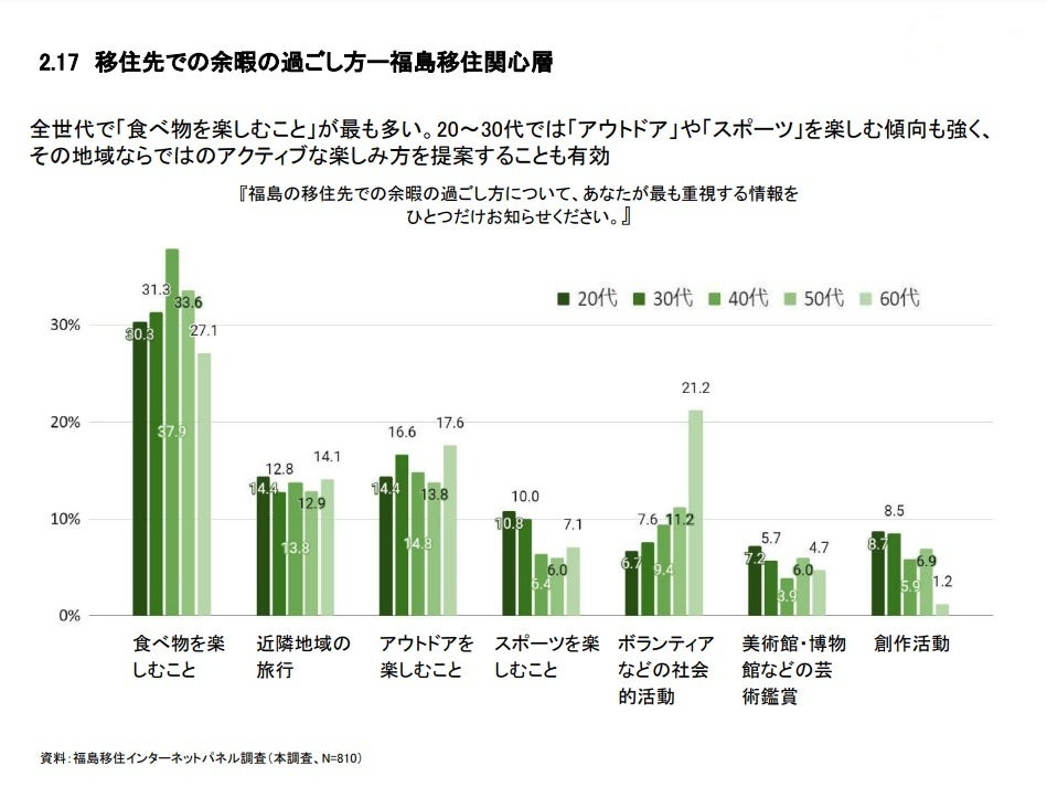 2023年12月にセンターが実施した第5回インターネットパネル調査では、移住先での余暇の過ごし方に関する質問において、福島移住関心層は全世代で「食べ物を楽しむこと」が最も多く、20~30代では「アウトドア」や「スポーツ」を楽しむ傾向も見られました。この結果から得られた、その地域ならではのアクティブな楽しみ方を提案することが有効と考え、今回特設ページを開設することになりました。
