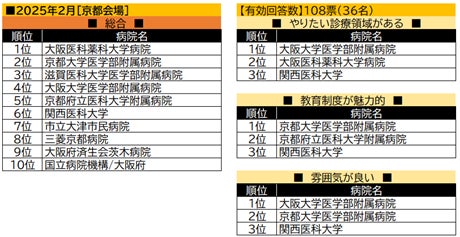 【京都会場】総トップは大阪医科薬科大学病院で、続く4位まではすべて大学病院が占有。その他も国公立・公的病院の名前が目立つ。項目別のベスト3もすべて大学病院がランクインする結果となった