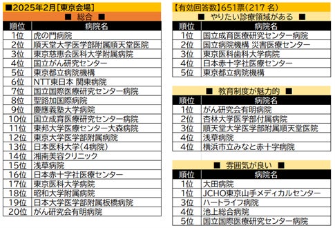 【東京会場】のトップ3は、虎の門病院、順天堂医院、慈恵医大病院。4位以下も全国的に知名度の高い病院がベスト10入りした。「やりたい診療領域」「教育制度が魅力的」「雰囲気がいい」の項目では、さまざまな病院がランクインし、知名度にとらわれない学生の選択眼が見て取れる結果となった
