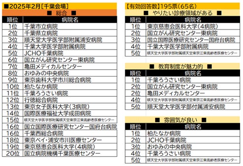 【千葉会場】では公立の千葉市立病院・千葉県立病院が2トップとなった。「総合」15位の順天堂大学医学部附属順天堂東京江東高齢者医療センターは、「やりたい診療領域がある」、「教育制度が魅力的」「雰囲気が良い」のすべての項目でベスト5入りしている。