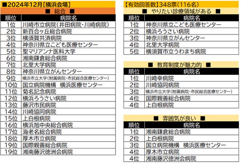 【横浜会場】の総合トップは川崎市立病院に。「やりたい診療領域がある」で首位の神奈川県立こども医療センターは総合4位にもランクイン。「教育制度が魅力的」、「雰囲気が良い」では民間病院が多くを占めた