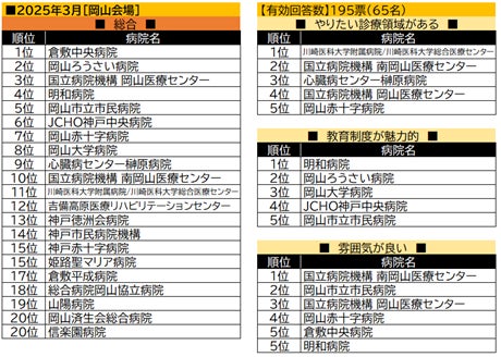 【岡山会場】で総合トップの倉敷中央病院は「雰囲気が良い」でも5位に。「教育制度が魅力的」首位の明和病院は、総合4位となった