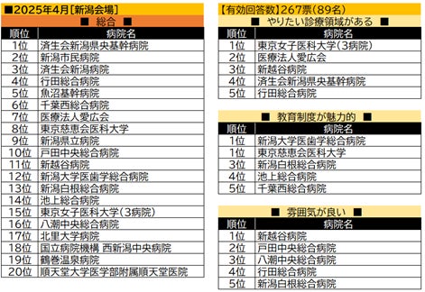 【新潟会場】総合トップの済生会新潟県央基幹病院は「やりたい診療領域がある」でも4位を獲得。総合2位では新潟市民病院、3位では済生会新潟病院と、県内の病院が占めた。新潟県は関東方面への転出者も多いため、東京・埼玉の病院名も挙がり、新潟会場らしい結果となった