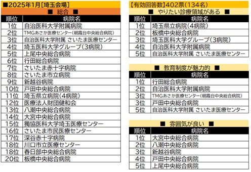 【埼玉会場】自治医科大学附属病院、埼玉医療センター、埼玉大学等の大学病院が上位を占めるなか、民間病院のTMGあさか医療センターが「「総合」2位、「教育制度が魅力的」3位を獲得。「雰囲気が良い」では、民間病院がベスト5のすべてを占めた