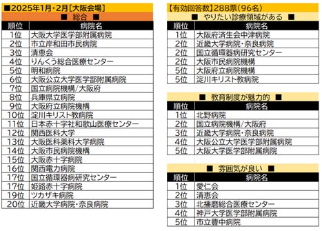 【大阪会場】総合1位である大阪大学医学部附属病院は、「教育制度が魅力的」でも5位にランクイン。全体的に、民間病院の上位ランクインが目立つ結果となった