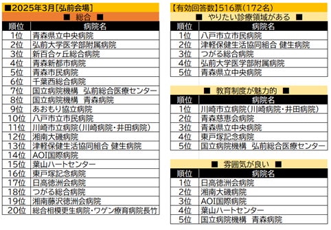 【弘前会場】の2トップは地元の青森県立病院と弘前大学医学部附属病院。青森県の病院が多くを占めるなか、「雰囲気が良い」では北海道の日高徳洲会病院が首位に
