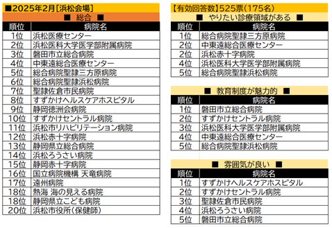 【浜松会場】の総合1位は浜松医療センター。2位の浜松大学医学部附属病院は「やりたい診療領域がある」「教育制度が魅力的」に同時ランクイン。総合3位の総合病院聖隷三方原病院は「教育制度が魅力的」「雰囲気が良い」でもランクインしている