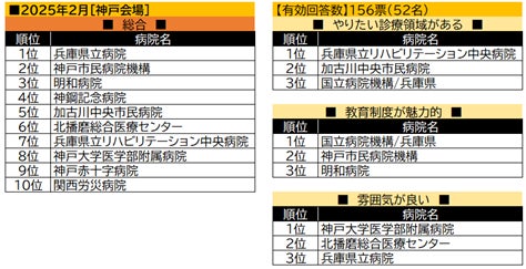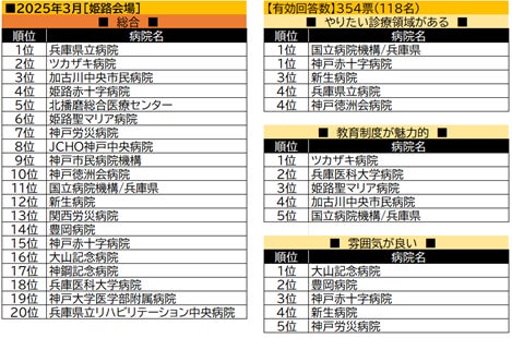 【姫路会場】神戸会場とともに、首位は兵庫県立病院となった。続く2位のツカザキ病院は、「教育制度が魅力的」では首位を獲得。総合3位の加古川中央市民病院も「教育制度が魅力的」で3位に