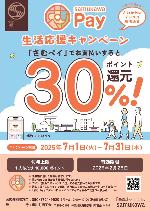 さむかわPayは、寒川町内の加盟店で使用できる地域活性化を目的としたキャッシュレス決済アプリです。今回のキャンペーンは物価高騰に対して生活を応援することを目的としています。町内の人だけでなく、町外の人でも寒川町の加盟店で、さむかわPayを使って買い物や食事等をすると30%分のポイント(1人あたり最大で10,000ポイント)が還元されます。