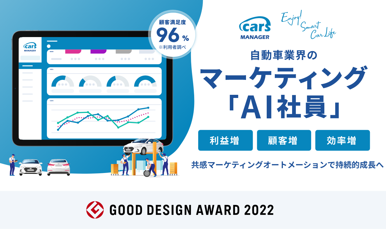 「cars MANAGER」は、自動車業界のマーケティングAI社員による顧客のカーライフに寄り添った共感マーケティングオートメーションサービスです。AIを活用した人とクルマのカーライフデータの収集・解析により、「経営支援」「集客支援」「複業支援」に利活用することで、持続的成長による「利益増」、「顧客増」、「効率増」を実現します。