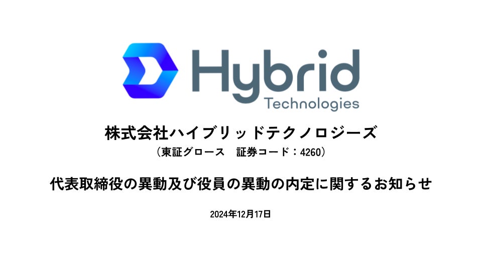 日本とベトナムのリソースを活用したハイブリッドなシステム開発を行う株式会社ハイブリッドテクノロジーズ(本社:東京都中央区、代表取締役社長 CEO:チャン バン ミン、証券コード:4260、以下「当社」)は、2024年12月16日開催の取締役会において、下記のとおり代表取締役の異動について内定いたしましたので、お知らせいたします。