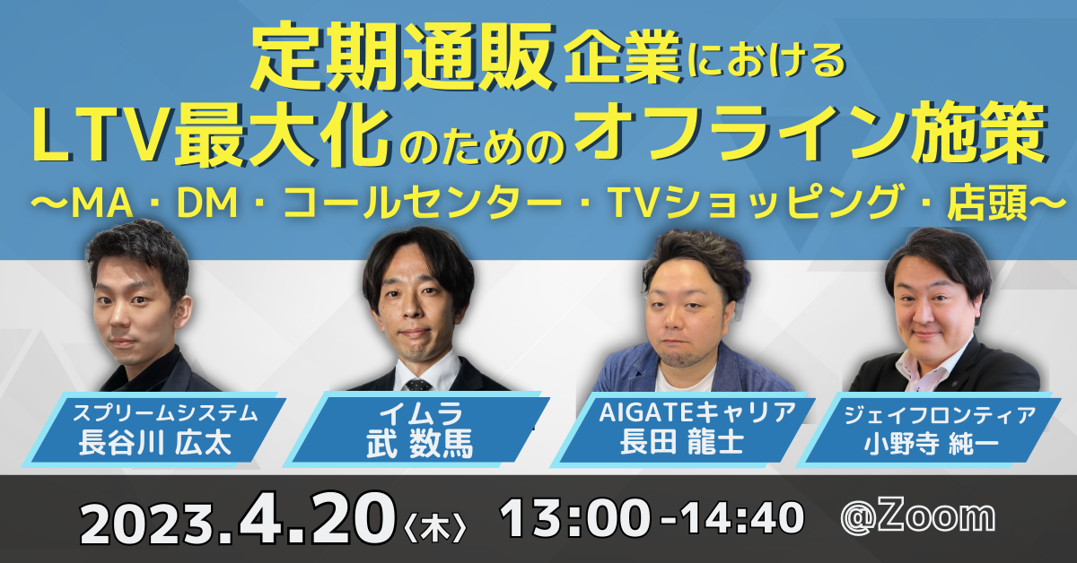 スプリームシステム株式会社(本社:東京都豊島区、代表取締役社長兼CEO:渡部 知博)は、2023年4月20日(水) 13時から株式会社イムラ、AIGATEキャリア株式会社、ジェイフロンティア株式会社と共同で「定期通販企業におけるLTV最大化のためのオフライン施策 ~MA・DM・コールセンター・TVショッピング・店頭~」と題した無料オンラインセミナーを開催いたします。