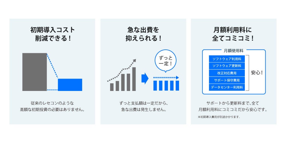 一度導入いただければその後は月額利用料(保守料込み)のみで「ずっと」お使いいただける「サブスクリプションモデル」です。従来のレセコンのような高額な初期投資の必要がない為、気軽に導入できるのは「POWER5G」だからこそです!