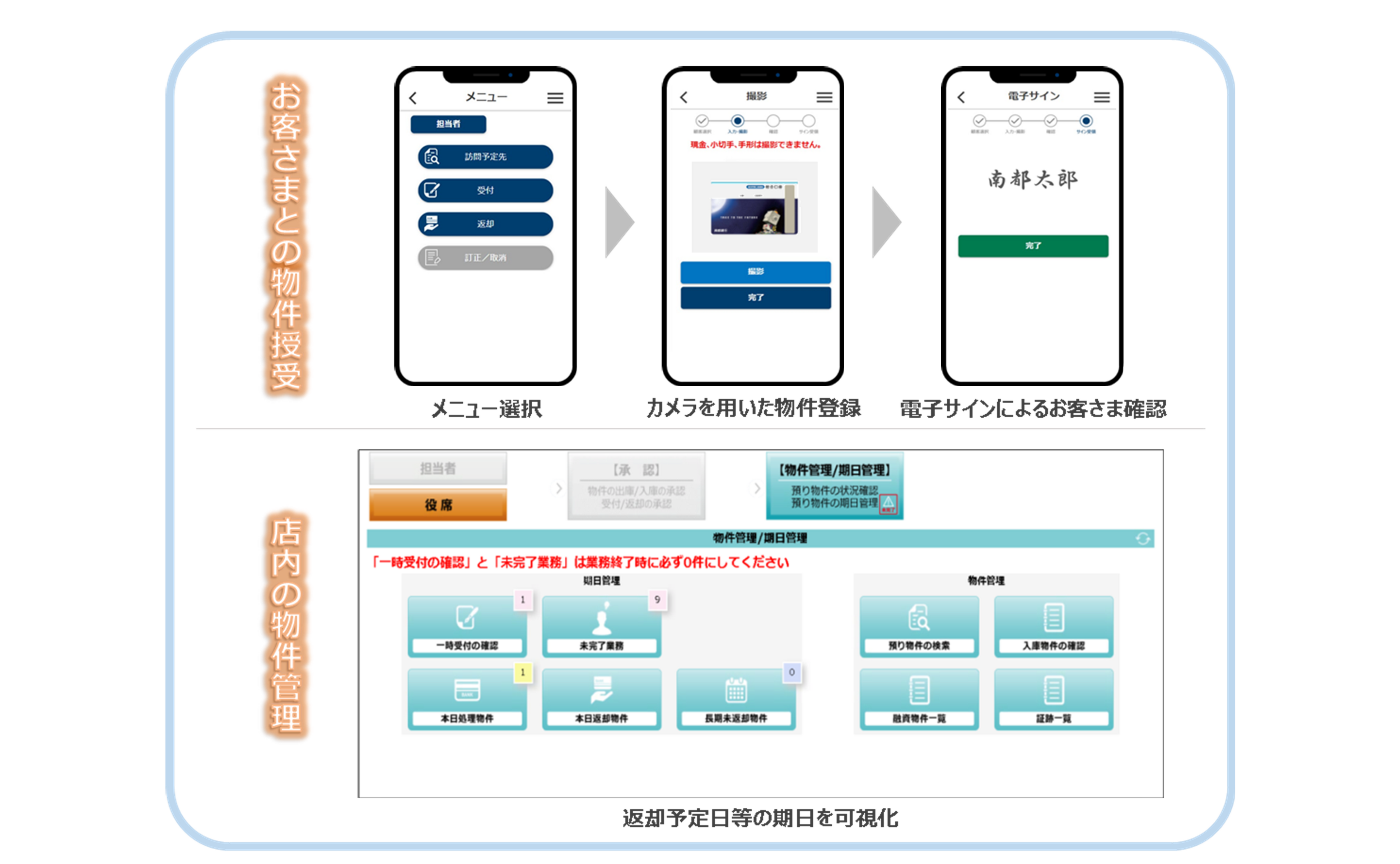 お客様からお預かりする各種申込書等の物件をスマートフォンで撮影し、電子サインをいただくことで受付が完了する仕組みとなっており、従来の手続きと比較し、お客様の待ち時間や手間を大幅に削減するものになります。また、お預かり時の位置情報の記録、システムによる期日の可視化等により、お預かりした物件をより安全かつ効率的に管理できる体制を構築することができます。