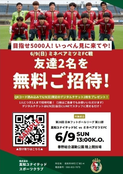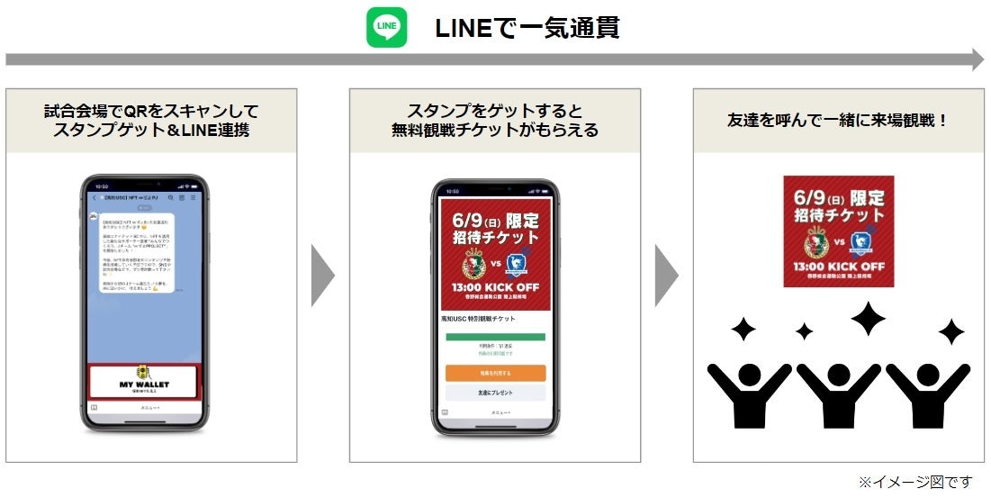 本プロジェクトの一環として、JFLリーグ戦ホーム試合への平均来場者数2,000人以上を達成するため、5月18日(土)に開催されるJFL第9節vsレイラック滋賀FCとのホーム試合にて、来場ボーナスとしてNFTを活用したデジタルチケットを配布するキャンペーンを実施します。本来は複数回の来場毎に来場証明となるNFTを取得することで来場スタンプが貯まり、特典がGETできる仕様となっておりますが、今施策については、5月18日(土)の来場スタンプを取得することで特典を入手することができます。特典は次回のホーム戦、6月9日(日)のミネベアミツミFC戦に無料観戦ができるデジタルチケットが2枚付与されます。デジタルチケットはLINEを介して家族や友だちに送ることができ、来場者数の増加、高知ユナイテッドSCとの関係人口創出を目指す施策になります。